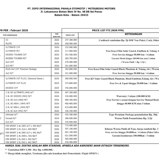 Pricelist Mitsubishi Batam – Update Februari 2026