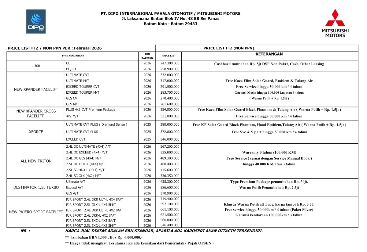 Pricelist Mitsubishi Batam – Update Februari 2026
